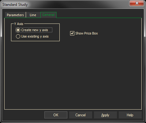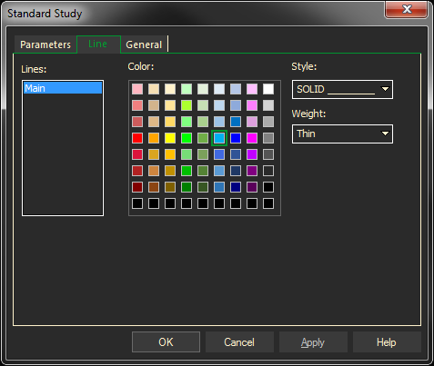 - Select the Line tab, you can set the color, style, or weight of the study line. Click on the arrows to the right of each text box, and make a selection from each list.