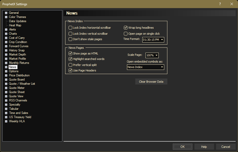 - Open unspecified display requests as: when an HTML News page contains symbols, this option allows you to select what type of Content Window to open when you click the symbol.