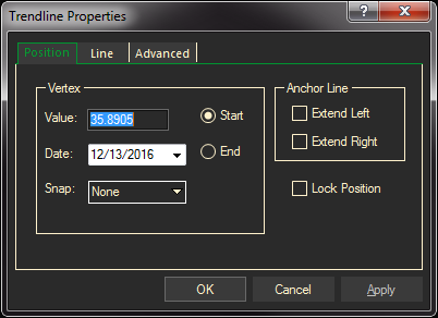 The Snap entry lets you select whether or not you want to snap the line to a specific price – Close, High, Low, Open, or do a Best Fit. The default is None
