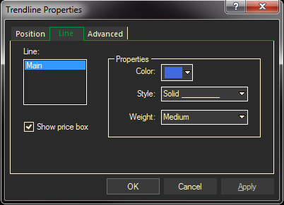 The Line tab will change the color, style, and weight of a line and determine whether or not the Price box will display on the y-scale.